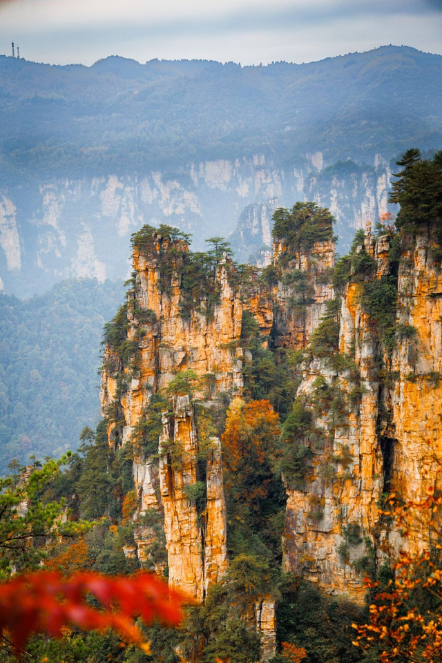 6/10 2024年11月9日,湖南张家界,立冬时节,张家界景区山峰高耸嶙峋,绚丽植被点缀山岩。