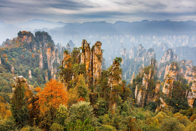 9/10 2024年11月9日,湖南张家界,立冬时节,张家界景区山峰高耸嶙峋,绚丽植被点缀山岩。