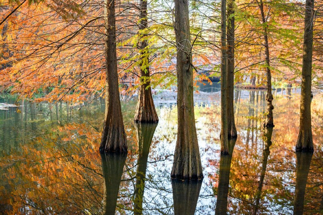 15/20 2024年11月30日,南京,明孝陵落羽杉换上了金黄与橙红交织的新衣,在阳光下色彩斑斓,在水面倒映下仿佛一幅油画。