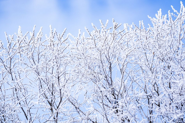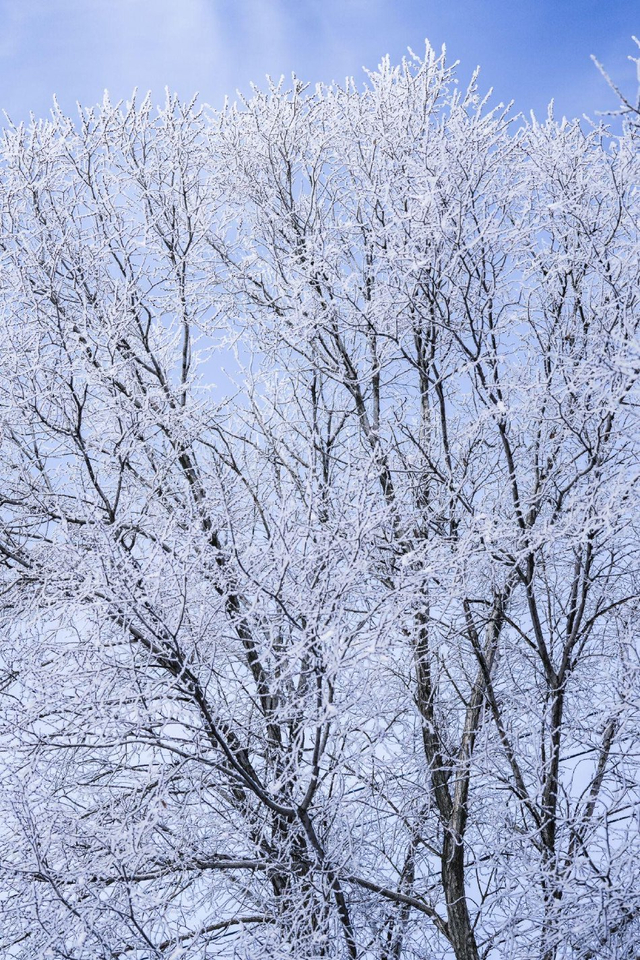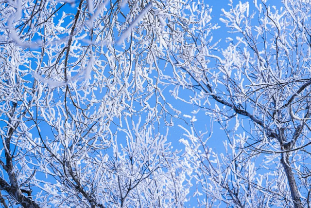 12/15 2024年11月30日,新疆昌吉州,在郊区一处林荫道,由于气温不断下降,昼夜的温差使得空气中的水汽渐渐凝聚,出现了大范围的雾凇景观。