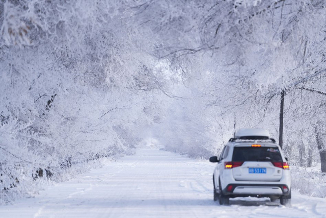 10/15 2024年11月30日,新疆昌吉州,在郊区一处林荫道,由于气温不断下降,昼夜的温差使得空气中的水汽渐渐凝聚,出现了大范围的雾凇景观。