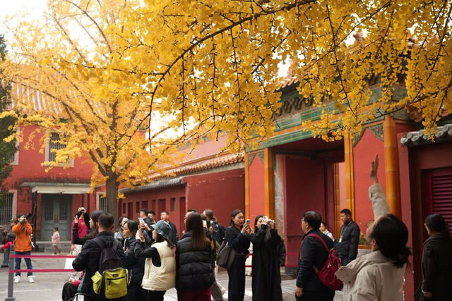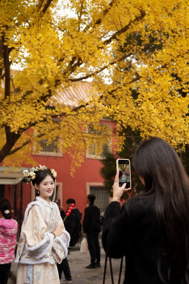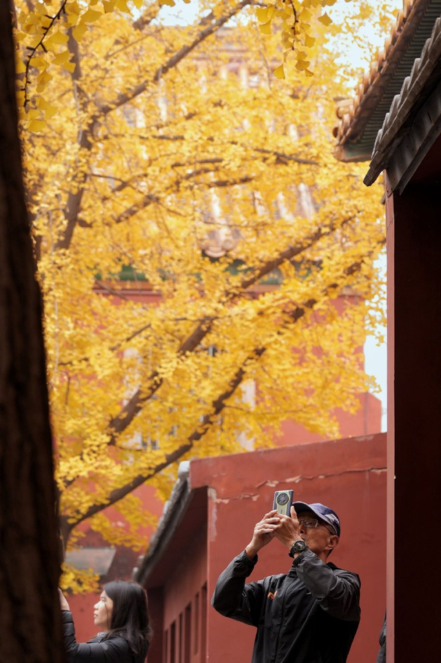 6/7 2024年11月2日,故宫博物院延禧宫,游客在银杏树下拍照。近日,故宫延禧宫金秋银杏进入最佳观赏期,吸引游客纷至沓来。 中新社记者 张祥毅 摄