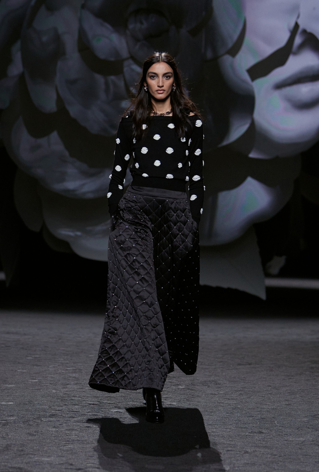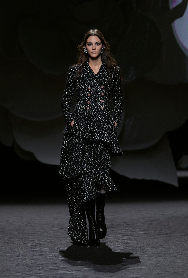 42/66 山茶花是CHANEL品牌的符号,维吉妮·维娅这样说道:“它令我感到安心又亲切,我钟爱它的柔软与力量。”CHANEL 2023秋冬高级成衣系列以这朵冬日之花为主题,它化作精巧点缀,或是浪漫主义气息的印花,绽放于口袋、外套、钮扣之上,配饰方面也无处不在回应山茶花元素,包袋、珠宝、发饰呈现立体花朵的形态,精致、灵动。