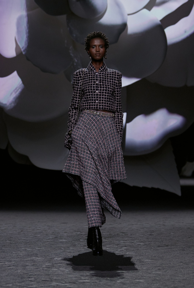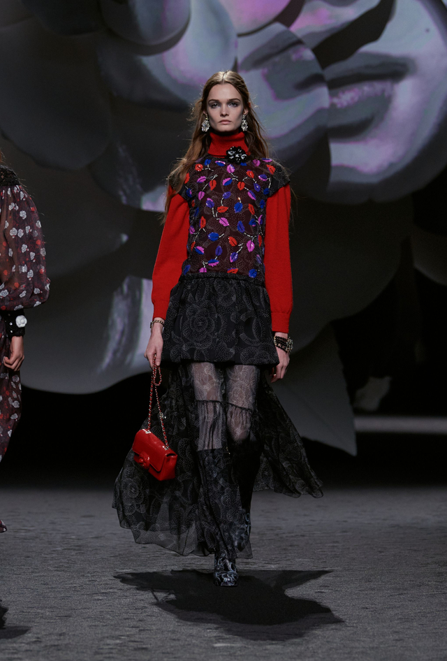 57/66 山茶花是CHANEL品牌的符号,维吉妮·维娅这样说道:“它令我感到安心又亲切,我钟爱它的柔软与力量。”CHANEL 2023秋冬高级成衣系列以这朵冬日之花为主题,它化作精巧点缀,或是浪漫主义气息的印花,绽放于口袋、外套、钮扣之上,配饰方面也无处不在回应山茶花元素,包袋、珠宝、发饰呈现立体花朵的形态,精致、灵动。