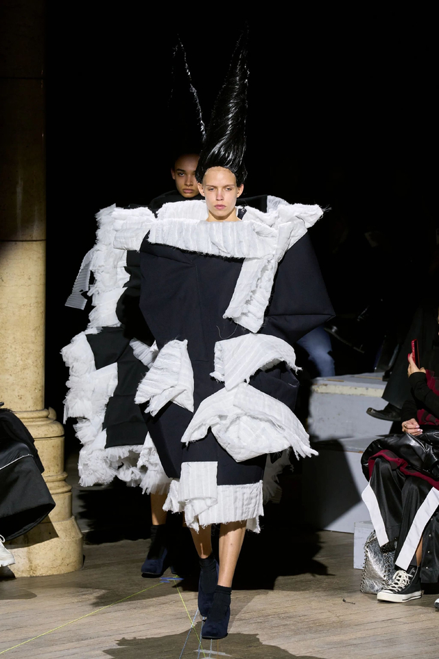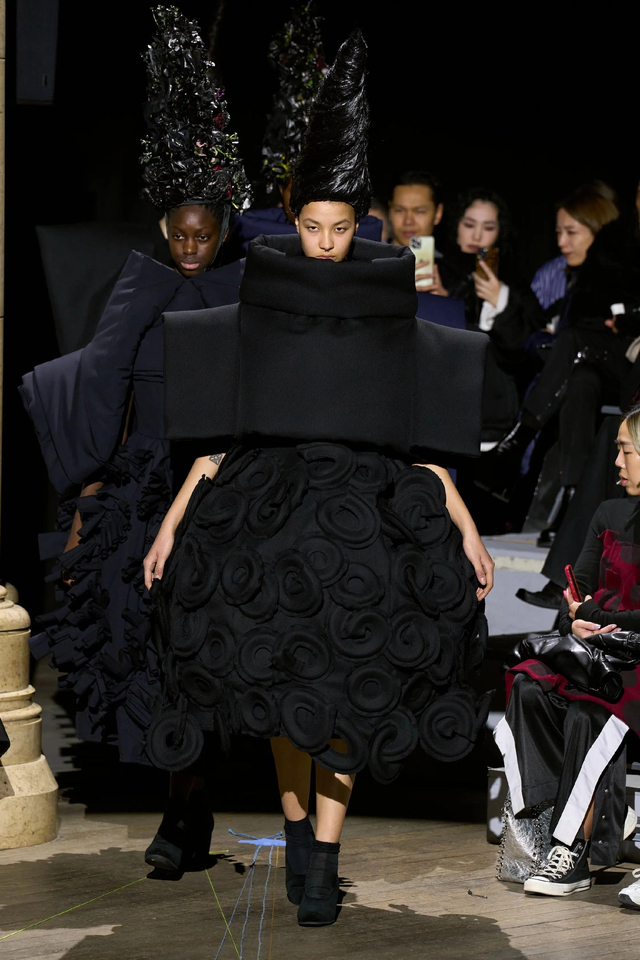 24/25 又是一个drama的系列!本季,Comme des Garcons通过11个章节,展示了品牌的前卫时尚。章节的每个部分都伴随着不同的音乐片段,美国大教堂的地板在不同颜色线的装点下,就像太阳系的轨道。纵向延伸的小丑帽、碎布条拼贴而成的连衣裙、拼贴立体装饰的黑色斗篷……如同宇宙大爆炸般集合在模特的服装之上,好看的皮囊千篇一律,有趣的灵魂万里挑一,抽象的时尚背后或许就是川久保玲的「有趣」。