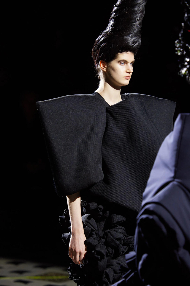 2/25 又是一个drama的系列!本季,Comme des Garcons通过11个章节,展示了品牌的前卫时尚。章节的每个部分都伴随着不同的音乐片段,美国大教堂的地板在不同颜色线的装点下,就像太阳系的轨道。纵向延伸的小丑帽、碎布条拼贴而成的连衣裙、拼贴立体装饰的黑色斗篷……如同宇宙大爆炸般集合在模特的服装之上,好看的皮囊千篇一律,有趣的灵魂万里挑一,抽象的时尚背后或许就是川久保玲的「有趣」。