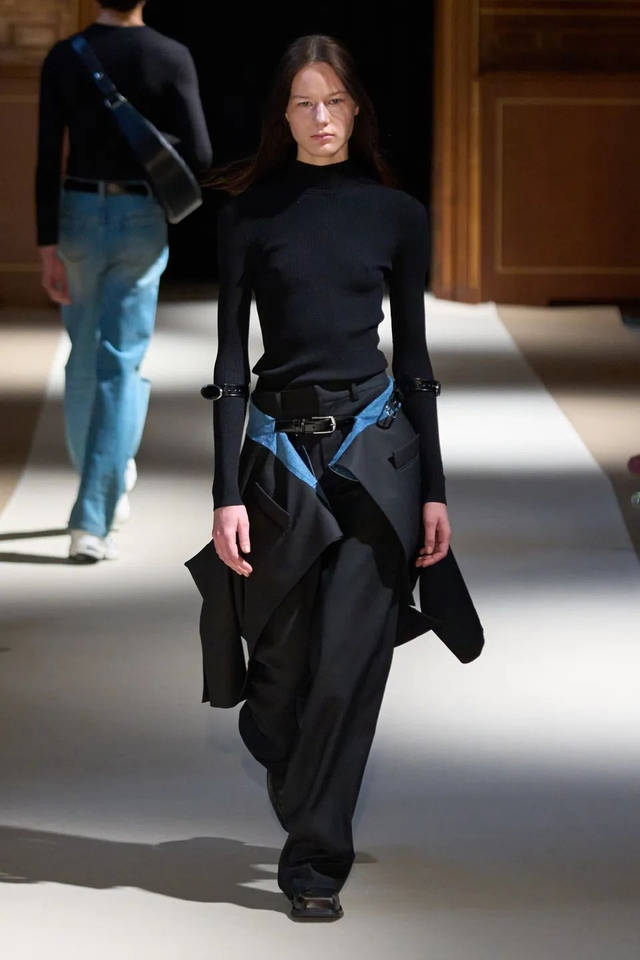 13/42 Calvin Luo 2023秋冬系列将男装与女装一起呈现,廓形模糊了性别界限。设计师对平衡的追求在上表现在轮廓的拼接和融合上。黑色九分款西装外套与白色过肩裙搭配其实是一件衣服,另一款无肩带牛仔上衣采用倒置牛仔裤搭配拼接皮革工装裤,形成连身裤,形成很有趣的面料组合。同样以蓝色显示的皮革工装裤是手工做旧,整个系列设计风格低调又富有新意~