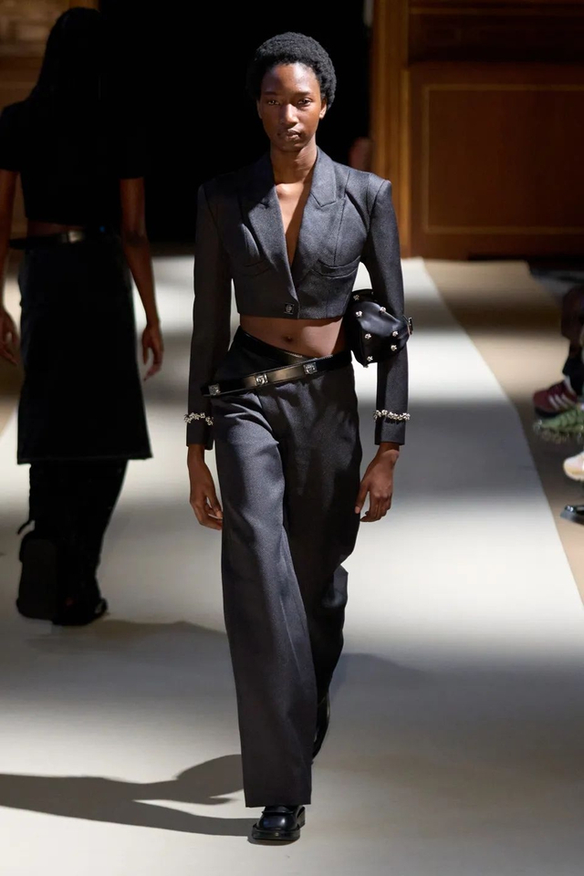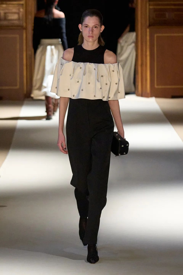 28/42 Calvin Luo 2023秋冬系列将男装与女装一起呈现,廓形模糊了性别界限。设计师对平衡的追求在上表现在轮廓的拼接和融合上。黑色九分款西装外套与白色过肩裙搭配其实是一件衣服,另一款无肩带牛仔上衣采用倒置牛仔裤搭配拼接皮革工装裤,形成连身裤,形成很有趣的面料组合。同样以蓝色显示的皮革工装裤是手工做旧,整个系列设计风格低调又富有新意~