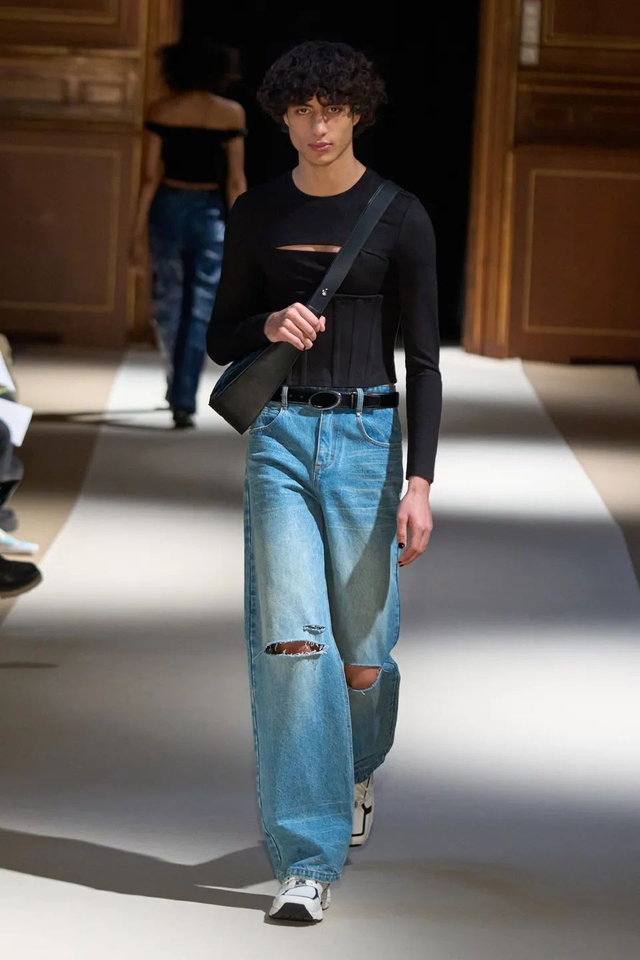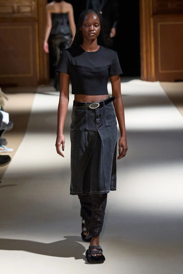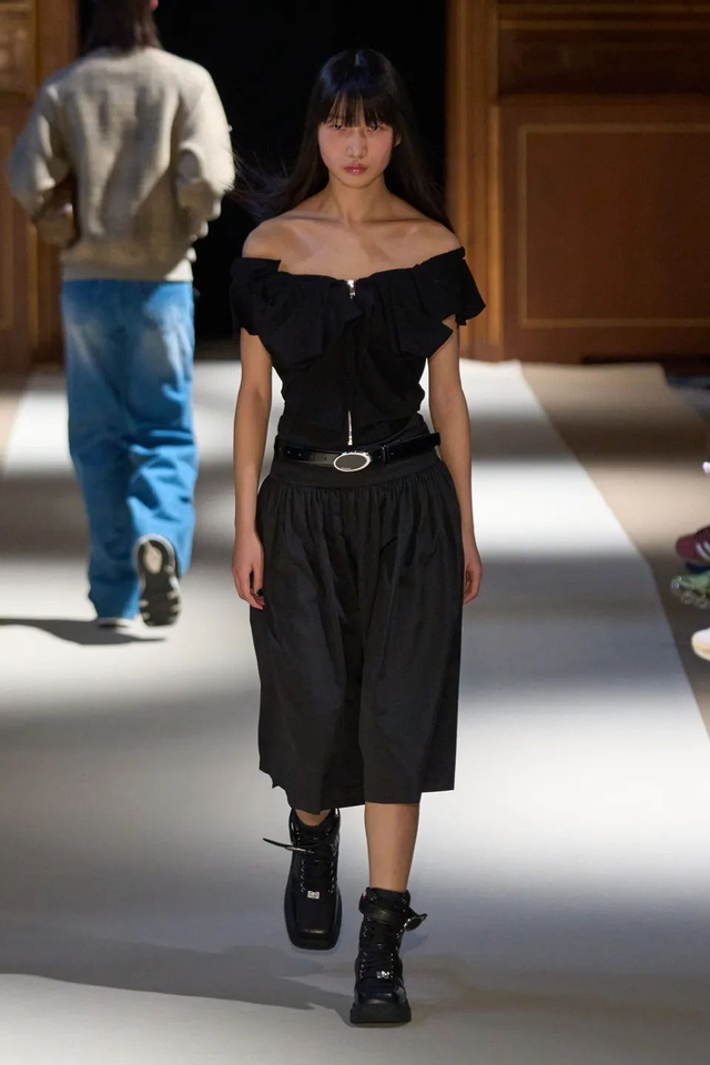 23/42 Calvin Luo 2023秋冬系列将男装与女装一起呈现,廓形模糊了性别界限。设计师对平衡的追求在上表现在轮廓的拼接和融合上。黑色九分款西装外套与白色过肩裙搭配其实是一件衣服,另一款无肩带牛仔上衣采用倒置牛仔裤搭配拼接皮革工装裤,形成连身裤,形成很有趣的面料组合。同样以蓝色显示的皮革工装裤是手工做旧,整个系列设计风格低调又富有新意~