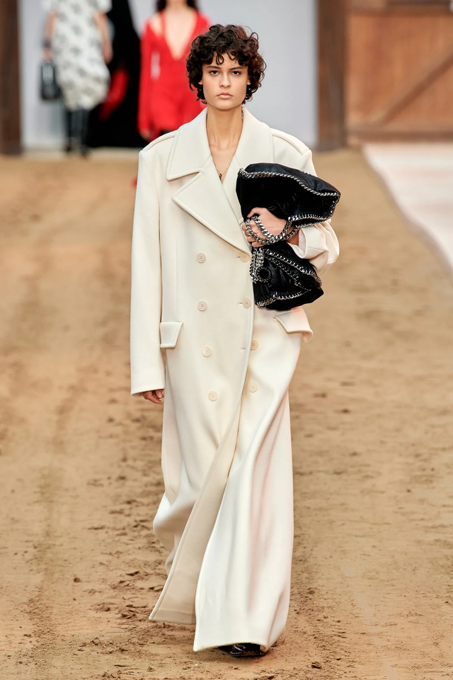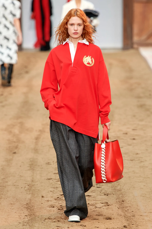 56/56 本季Stella McCartney以“HORSE POWER“为主题,将马术元素应用到新一季的时装,这种融合体现在轻薄的轻骑兵夹克、小背心、马术文化的解构牛仔西装,以及低腰裤等单品上。品牌用先进的动物皮革替代品制作了新手袋,一款是采用植物性、无塑料材料;一款是用苹果废料制成鳄鱼效果;一款用白色蘑菇制成的,充分延续品牌的可持续时尚理念。