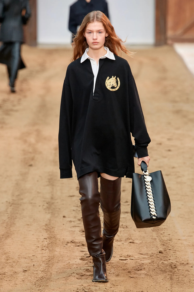 22/56 本季Stella McCartney以“HORSE POWER“为主题,将马术元素应用到新一季的时装,这种融合体现在轻薄的轻骑兵夹克、小背心、马术文化的解构牛仔西装,以及低腰裤等单品上。品牌用先进的动物皮革替代品制作了新手袋,一款是采用植物性、无塑料材料;一款是用苹果废料制成鳄鱼效果;一款用白色蘑菇制成的,充分延续品牌的可持续时尚理念。