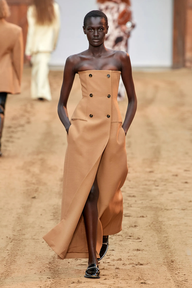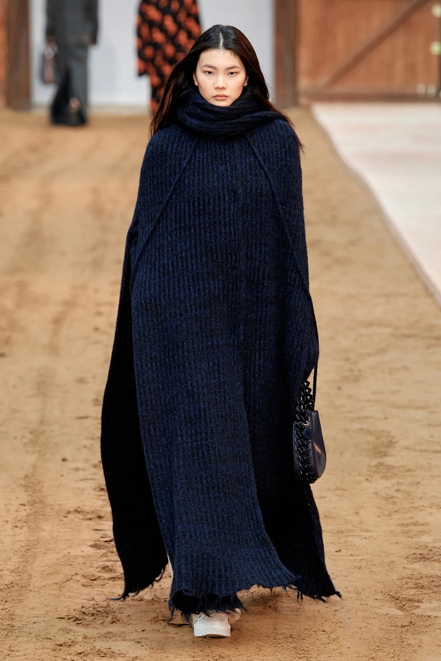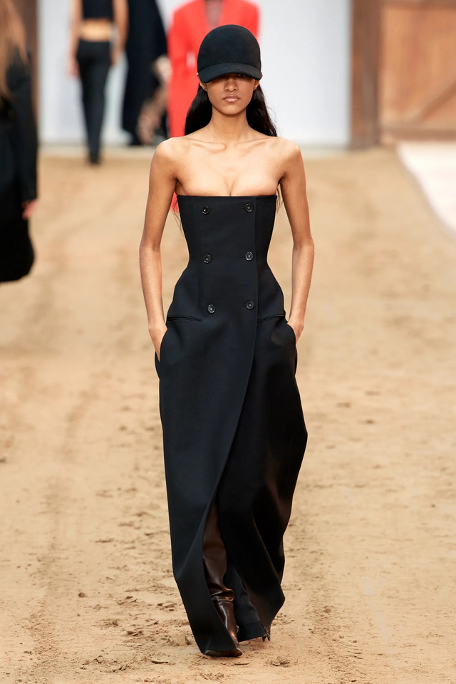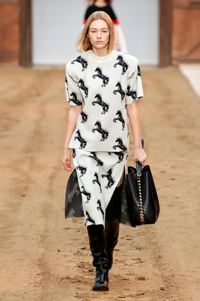 9/56 本季Stella McCartney以“HORSE POWER“为主题,将马术元素应用到新一季的时装,这种融合体现在轻薄的轻骑兵夹克、小背心、马术文化的解构牛仔西装,以及低腰裤等单品上。品牌用先进的动物皮革替代品制作了新手袋,一款是采用植物性、无塑料材料;一款是用苹果废料制成鳄鱼效果;一款用白色蘑菇制成的,充分延续品牌的可持续时尚理念。