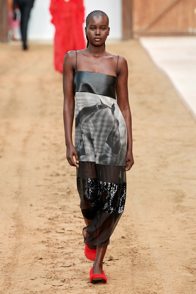 23/56 本季Stella McCartney以“HORSE POWER“为主题,将马术元素应用到新一季的时装,这种融合体现在轻薄的轻骑兵夹克、小背心、马术文化的解构牛仔西装,以及低腰裤等单品上。品牌用先进的动物皮革替代品制作了新手袋,一款是采用植物性、无塑料材料;一款是用苹果废料制成鳄鱼效果;一款用白色蘑菇制成的,充分延续品牌的可持续时尚理念。