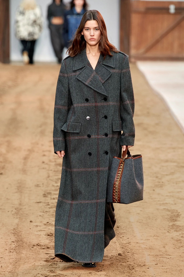 27/56 本季Stella McCartney以“HORSE POWER“为主题,将马术元素应用到新一季的时装,这种融合体现在轻薄的轻骑兵夹克、小背心、马术文化的解构牛仔西装,以及低腰裤等单品上。品牌用先进的动物皮革替代品制作了新手袋,一款是采用植物性、无塑料材料;一款是用苹果废料制成鳄鱼效果;一款用白色蘑菇制成的,充分延续品牌的可持续时尚理念。