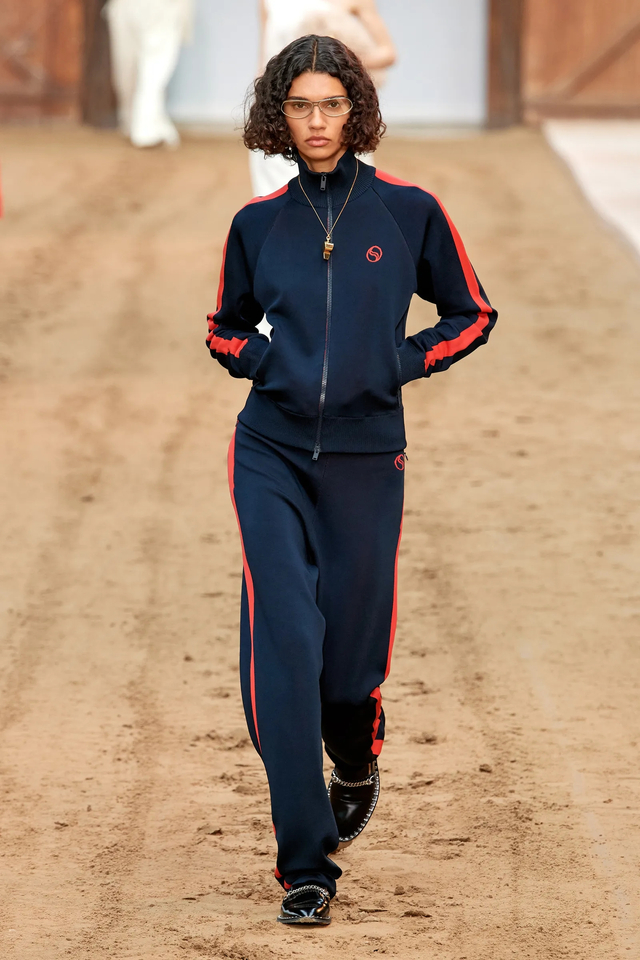 39/56 本季Stella McCartney以“HORSE POWER“为主题,将马术元素应用到新一季的时装,这种融合体现在轻薄的轻骑兵夹克、小背心、马术文化的解构牛仔西装,以及低腰裤等单品上。品牌用先进的动物皮革替代品制作了新手袋,一款是采用植物性、无塑料材料;一款是用苹果废料制成鳄鱼效果;一款用白色蘑菇制成的,充分延续品牌的可持续时尚理念。
