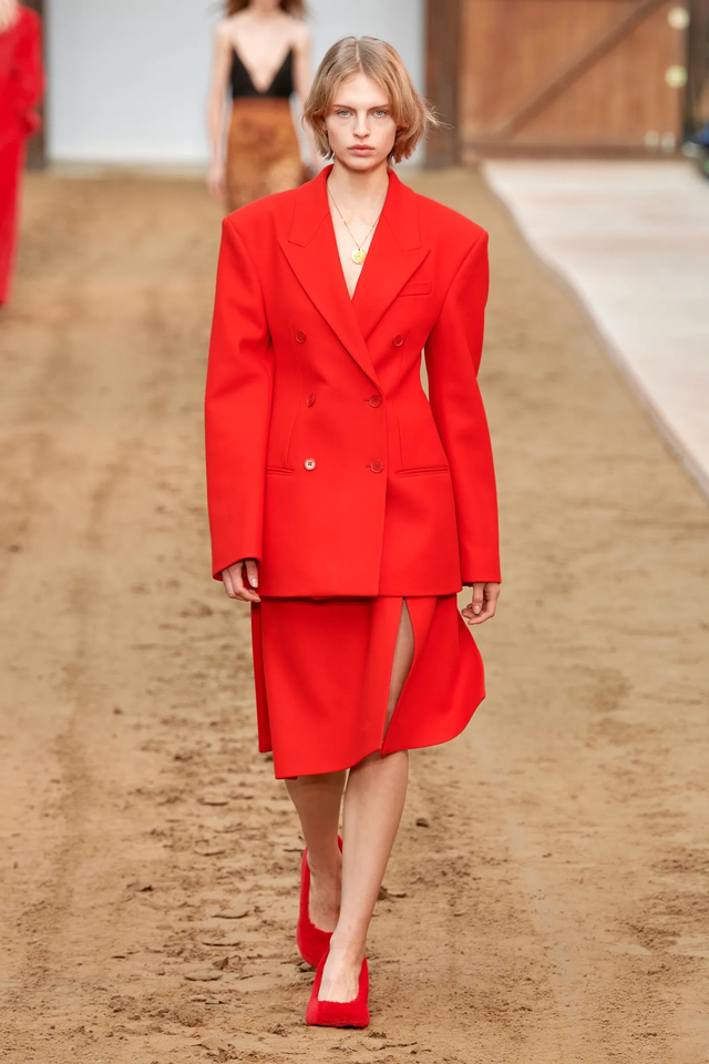 34/56 本季Stella McCartney以“HORSE POWER“为主题,将马术元素应用到新一季的时装,这种融合体现在轻薄的轻骑兵夹克、小背心、马术文化的解构牛仔西装,以及低腰裤等单品上。品牌用先进的动物皮革替代品制作了新手袋,一款是采用植物性、无塑料材料;一款是用苹果废料制成鳄鱼效果;一款用白色蘑菇制成的,充分延续品牌的可持续时尚理念。
