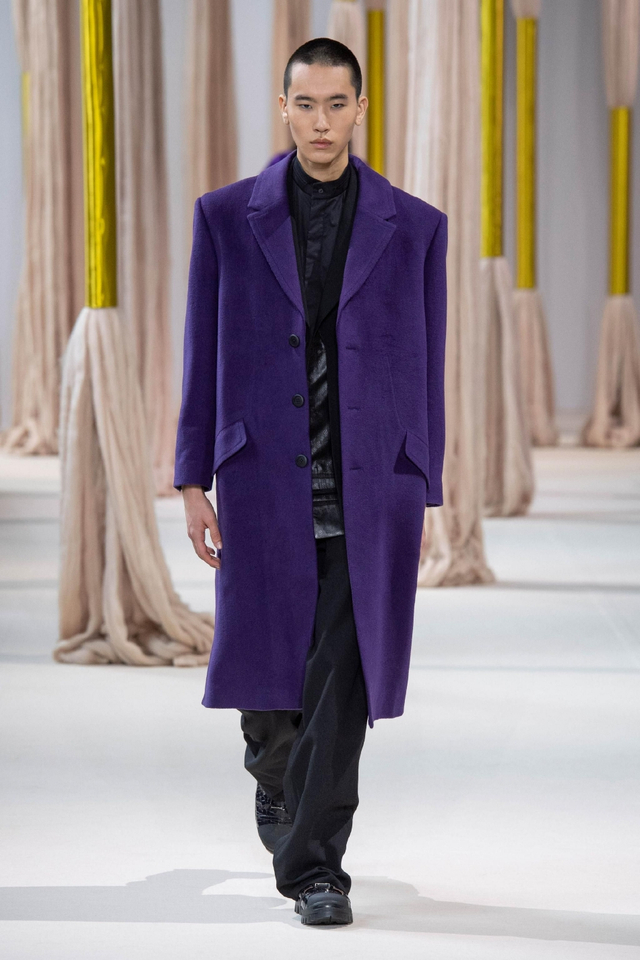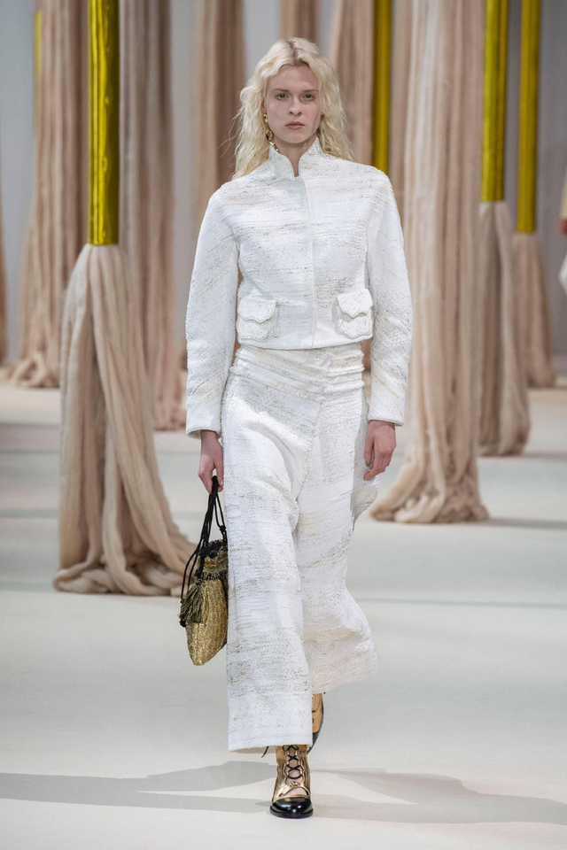 14/24 伴随着混音组曲,数十位东西方模特身着秋冬系列新装,穿过巨型丝线装置款款登台。设计总监王陈彩霞女士以人与人更紧密的情感联结为发想,由中国古代女性亲手绣制、寄寓并传递情感的荷包撷取灵感,将东方民族的精妙审美与深敛情思化作绵绵绣线,交织埋植于西方经典服装理念。旗袍和斜襟剪裁大量出现在作品中,俐落领口和熨帖腰线勾勒温婉身姿,模拟荷包心形轮廓的西式宽袖外套和曳地礼服裙则赋予包裹在华丽织物里的身体力量感。跨越文化藩篱,缔造风格交融的协奏曲,将SHIATZY CHEN开创的“新中式优雅”风格提升至新高度。
