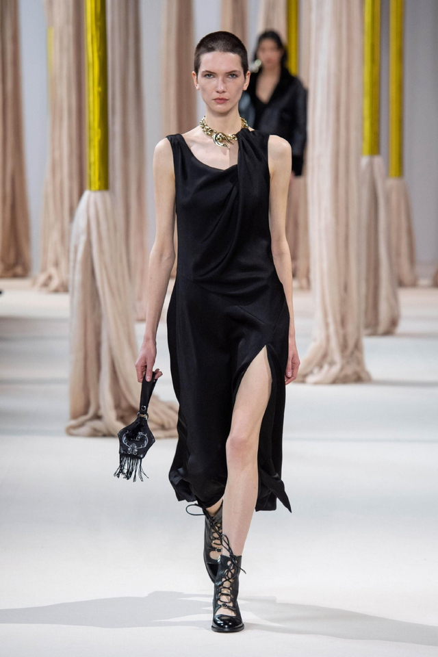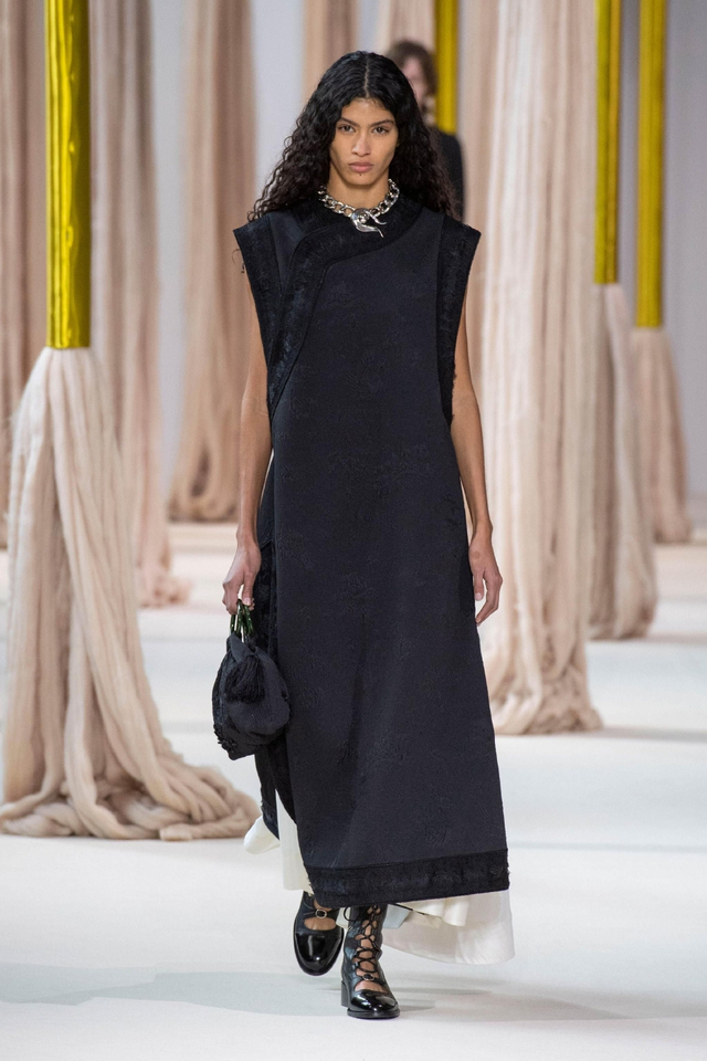 6/24 伴随着混音组曲,数十位东西方模特身着秋冬系列新装,穿过巨型丝线装置款款登台。设计总监王陈彩霞女士以人与人更紧密的情感联结为发想,由中国古代女性亲手绣制、寄寓并传递情感的荷包撷取灵感,将东方民族的精妙审美与深敛情思化作绵绵绣线,交织埋植于西方经典服装理念。旗袍和斜襟剪裁大量出现在作品中,俐落领口和熨帖腰线勾勒温婉身姿,模拟荷包心形轮廓的西式宽袖外套和曳地礼服裙则赋予包裹在华丽织物里的身体力量感。跨越文化藩篱,缔造风格交融的协奏曲,将SHIATZY CHEN开创的“新中式优雅”风格提升至新高度。