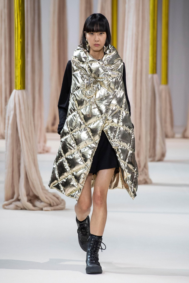5/24 伴随着混音组曲,数十位东西方模特身着秋冬系列新装,穿过巨型丝线装置款款登台。设计总监王陈彩霞女士以人与人更紧密的情感联结为发想,由中国古代女性亲手绣制、寄寓并传递情感的荷包撷取灵感,将东方民族的精妙审美与深敛情思化作绵绵绣线,交织埋植于西方经典服装理念。旗袍和斜襟剪裁大量出现在作品中,俐落领口和熨帖腰线勾勒温婉身姿,模拟荷包心形轮廓的西式宽袖外套和曳地礼服裙则赋予包裹在华丽织物里的身体力量感。跨越文化藩篱,缔造风格交融的协奏曲,将SHIATZY CHEN开创的“新中式优雅”风格提升至新高度。