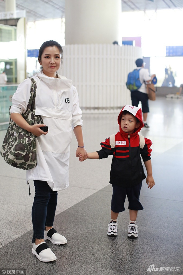 何洁携子清爽亮相 七宝脸上露疤狂躲镜头