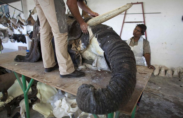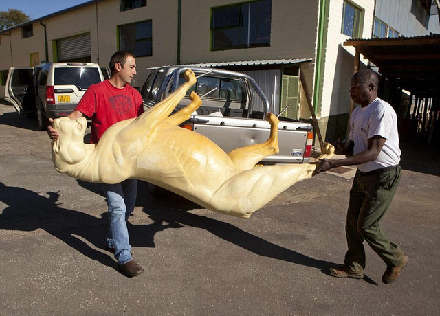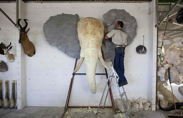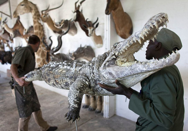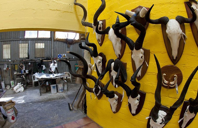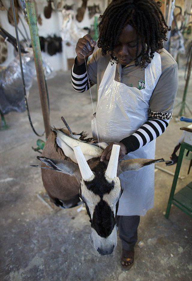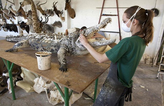11/21 【环球网综合报道】据英国《每日邮报》7月29日报道,在纳米比亚首都温特和克城外的一家动物标本剥制工厂里,工人们忙碌着将客户送来的各种动物剥皮后填充,制成栩栩如生的动物标本,大象、猎豹、羚羊,甚至是狮子和鳄鱼,无所不有。
