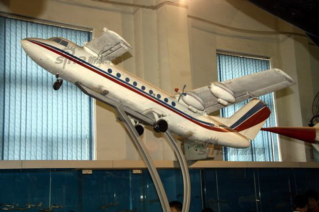 8/15 1975年,三机部发出768号文件,确定“抬”式机研究为国家航空重点科研项目,并确定 751 任务,1976年,“751”抬式战斗机方案提出,该方案是在前翼上展向吹气来加强涡系的有力干扰。图为收藏在西北工业大学航空馆内的701抬式运输机方案“延安”号改型模型。